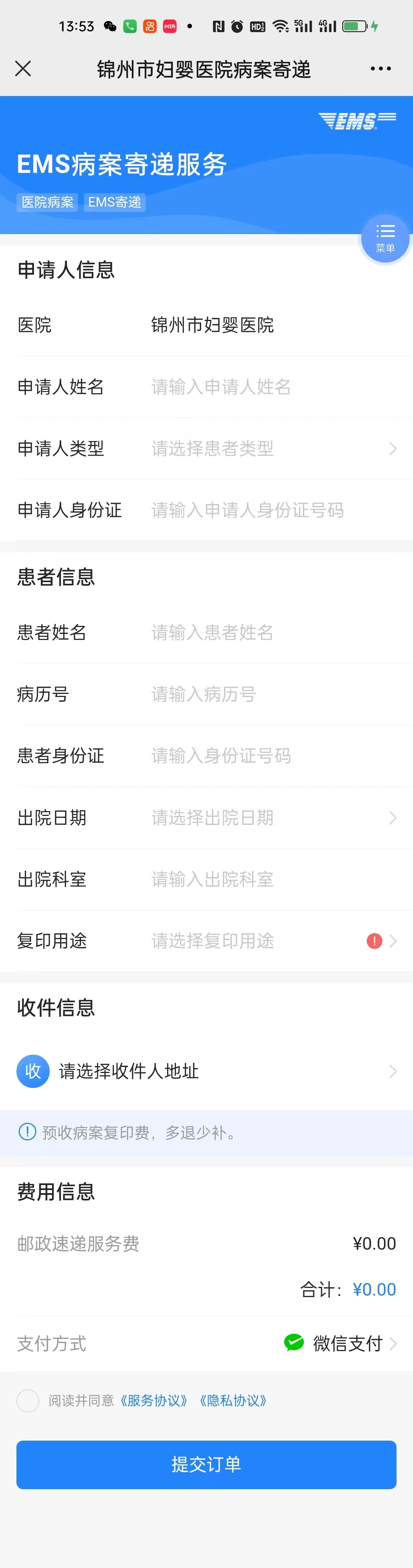 好消息,为了方便广大患者,锦州市妇婴医院联合中国邮政开展了住院病历邮寄业务,您只要微信申请,即可实现足不出户,病案邮寄到家!