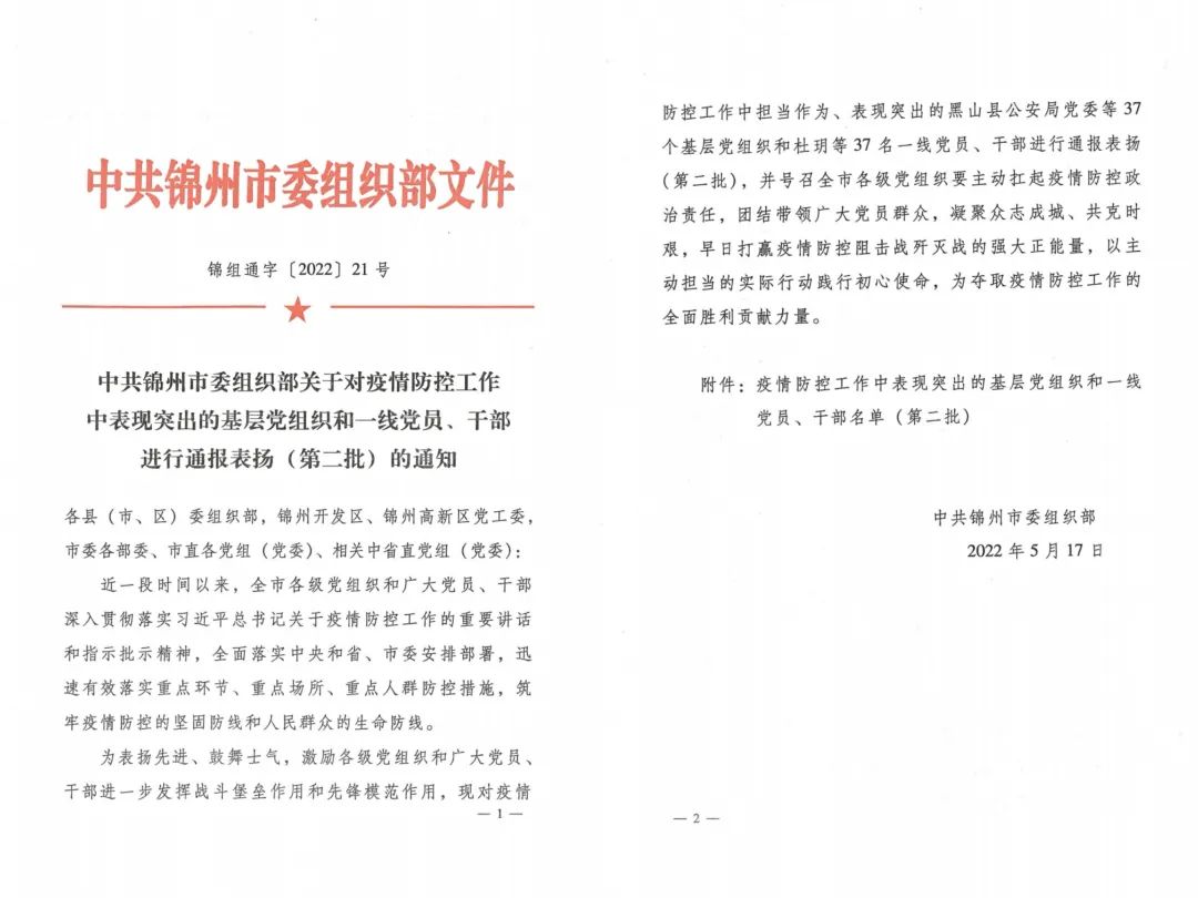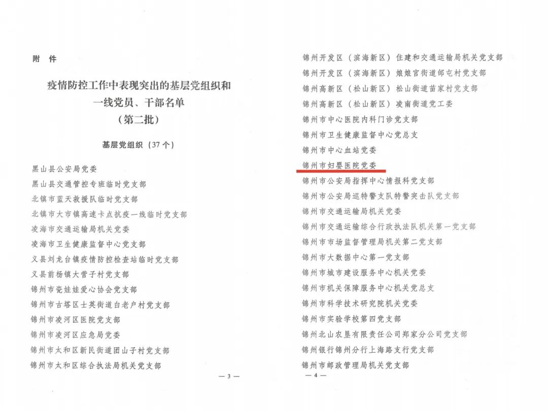 近日,锦州市委组织部发布了《中共锦州市委组织部关于对疫情防控工作中表现突出的基层党组织和一线党员、干部进行通报表扬(第二批)的通知》,对基层党组织和表现突出的一线党员、干部进行通报表扬,锦州市妇婴医院党委荣获“疫情防控中表现突出的基层党组织”殊荣。疫情以来,医院党委深入贯彻习近平总书记关于疫情防控工作重要讲话重要指示批示精神,全面落实市委、市卫健委党组关于疫情防控工作的部署要求,号召全院各党支部和广大党员干部积极发挥作用,为坚决打赢疫情防控“歼灭战”贡献力量,让党旗在疫情防控第一线高高飘扬。