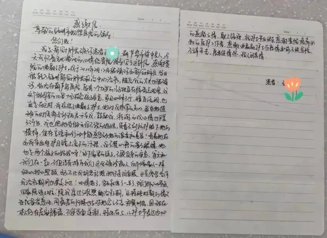 产三科护士曲晶晶同志接到任务后,留下家中两个年幼的孩子,克服家里的困难,坚决奔赴一线参加工作。在支援的48天里,她履行着一名党员的职责与担当,对工作认真负责,对患者细心照顾。进入负压病房后,一位特殊的患者引起了细心的曲晶晶的注意。患者是一位九岁孩子的妈妈,她在锦州治疗,九岁的孩子独自在隔离点观察,在查房时几次看到患者偷偷躲在角落里落泪,了解情况后,身为母亲的她能体会患者担心孩子的焦虑心情,每天进入病房后,都会抽时间陪患者聊天,鼓励开导患者,帮助患者树立战胜疾病的信心,这与治疗同等重要,患者慢慢地从最初的消极悲观转变为乐观开朗,特殊时期的情谊让患者备受感动。这位母亲虽看不到防护服下护士的模样,但在行动和言语中深深地感受到她的善良与温暖,感谢白衣天使们在疫情面前不惧危险,不辞辛苦。出院在即,患者内心的万分感动化作一封写给院领导的感谢信,千言万语汇成了一面红彤彤的锦旗,感谢曲晶晶护士,感恩妇婴人在疫情面前英勇无畏、逆行守护。