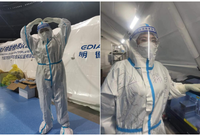 妇婴人张淼,本次是她第一次抗疫支援,身为一名共产党员,她时刻以共产党员的标准要求自己,用自己最饱满的热情全心全意的投入到核酸检测工作中。虽然第二天因为方舱的负压不适呕吐,她却只是出去喝点水后又马上穿上防护服进入方舱,投入紧张的工作当中。每天拆试剂、加样本、上机。她所在的2-2区创下了6时加完140板96孔样本的奇迹,不过这让她的手“胖”了一圈,她还和其他人开玩笑的说:“这胖是工伤”。因为担心夜班无法让自己在工作中保持高度集中,她又研究出个清醒新套餐“咖啡兑红牛,精神一整宿”。每年的中秋节都陪伴在父母身边的她,今年中秋节有了不一样的心愿——疫情消散,春回人间。国泰民安,疫情早散。