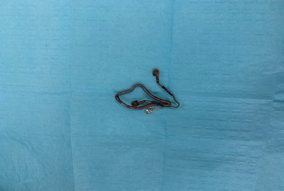 计划生育科高度重视,主任朱淑杰进行会诊,行术前放射线检查提示宫内置环,见两个节育环影像。追问病史,患者9年前曾因“带环妊娠”于其他医院行人流术,术中情况不明、术后未复查,未做相关检查就于当地诊所行节育环放置术。现确定诊断为宫内置环、两种不同节育环,完善相关检查后于当日行超导可视无痛节育环取出术,取出两枚完整重叠的节育环。