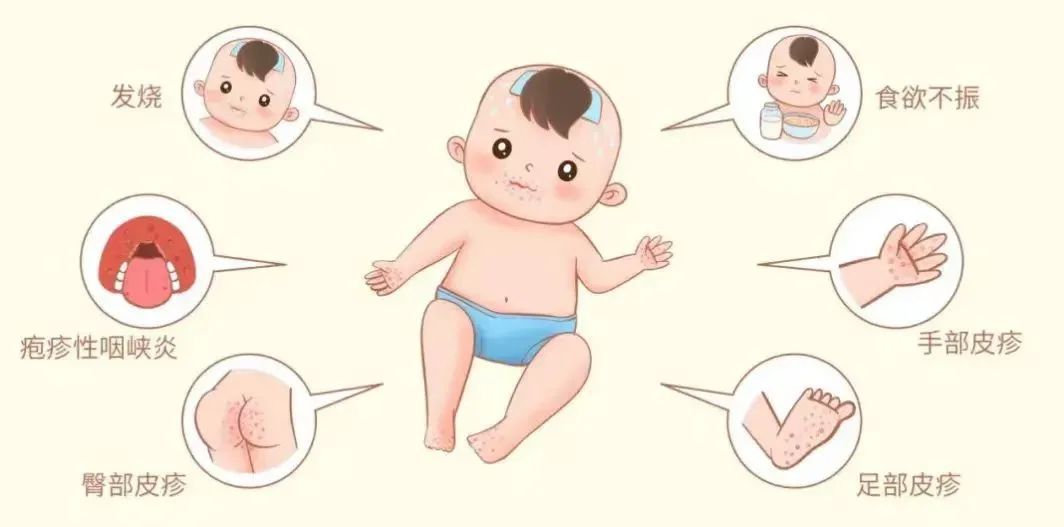 手足口病是由肠道病毒引起的婴幼儿常见传染病。引起手足口病的肠道病毒有20多种,主要是柯萨奇病毒A组4、5、7、9、10、16型和B组2、5、13型,肠道病毒71型。人群对手足口病普遍易感,主要以学龄前儿童为主。