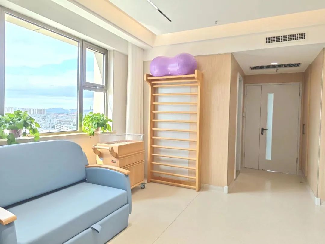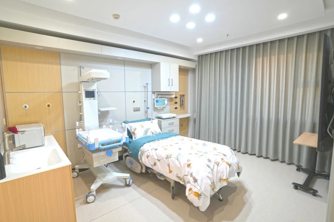 房间内配备了多种医疗设施,如多功能产床、新生儿复苏辐射保暖台、接产无影灯、分娩球、分娩凳、导乐车、摇椅、母婴监护仪、婴儿床、新生儿沐浴抚触台、空气消毒机、床单位臭氧消毒机、床旁智能交互系统等,享有集产科医生、新生儿科医生、麻醉师、助产士、母婴护士“五位一体”的高质量、高标准的服务。