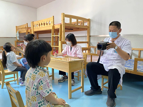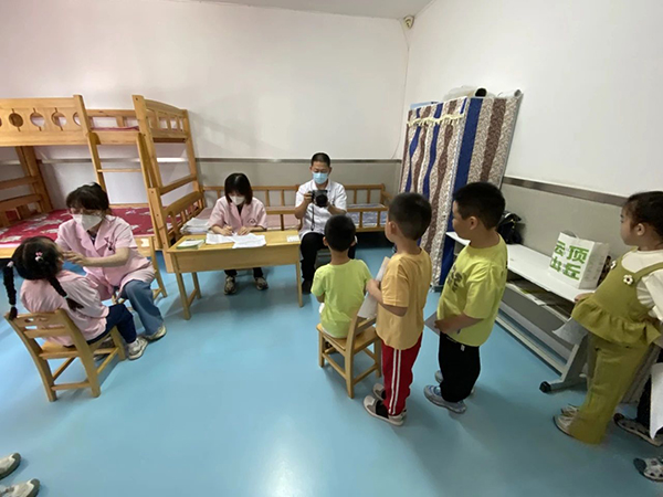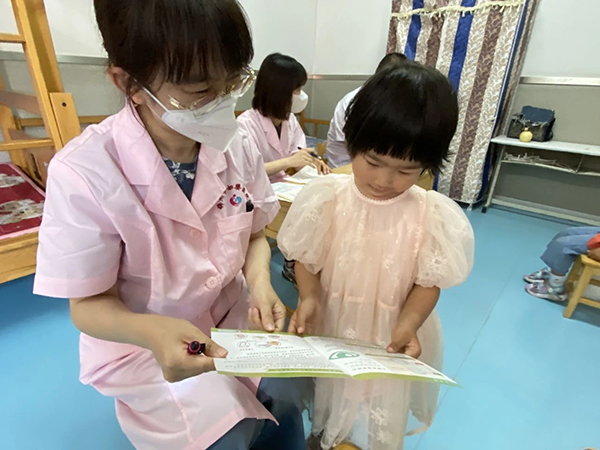 眼科门诊安龙医生为孩子们进行视力检查,根据检查结果提供专业的健康指导和进一步诊疗建议。儿童综合发展中心杨楠和赵竟延医生用通俗易懂的语言为幼儿园小朋友讲解爱眼、护眼知识,教育孩子们从小养成良好的用眼卫生习惯,掌握正确的读写姿势并定期检查视力,以及如何预防近视等。活动中共发放儿童近视防控宣传手册50余册。
