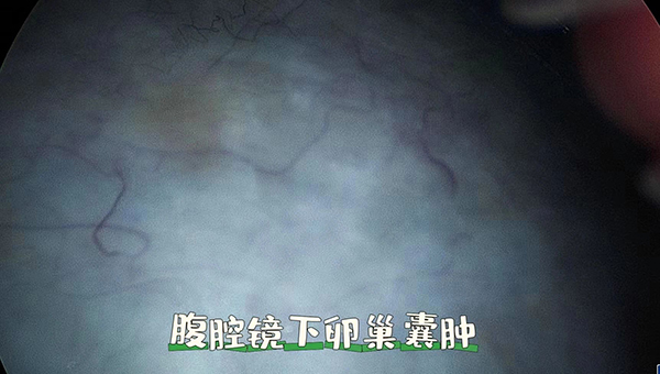 手术当日,随着腹腔镜的进入,1个巨大卵巢囊肿映入眼帘,肿物占据了盆腹腔,上界达脐上4指!只见金院长首先对囊肿进行穿刺吸出其内液体,缩小肿物体积,之后通过脐部的切口逐步将囊肿完整剥离、取出,直视下仔细缝合创面,很好的保护了患者的卵巢功能。术中病理检查证实肿物为良性,术中吸出的液体达1500ml!