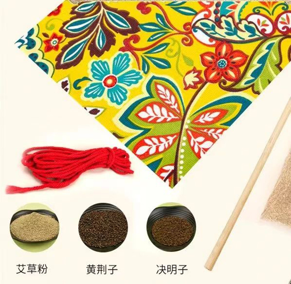 课堂上,我们准备了艾草末、决明子、黄荆子、无纺布袋、木棍、绳子、小花布等制作材料。