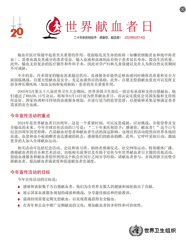 今年正值世界献血者日设立20周年,这是一个重要的时刻,向全球各地的献血者表示衷心的感谢,感谢他们多年来的无私奉献和拯救生命的善举。他们的行动不仅彰显了人性的光辉,也为患者带来了生的希望。