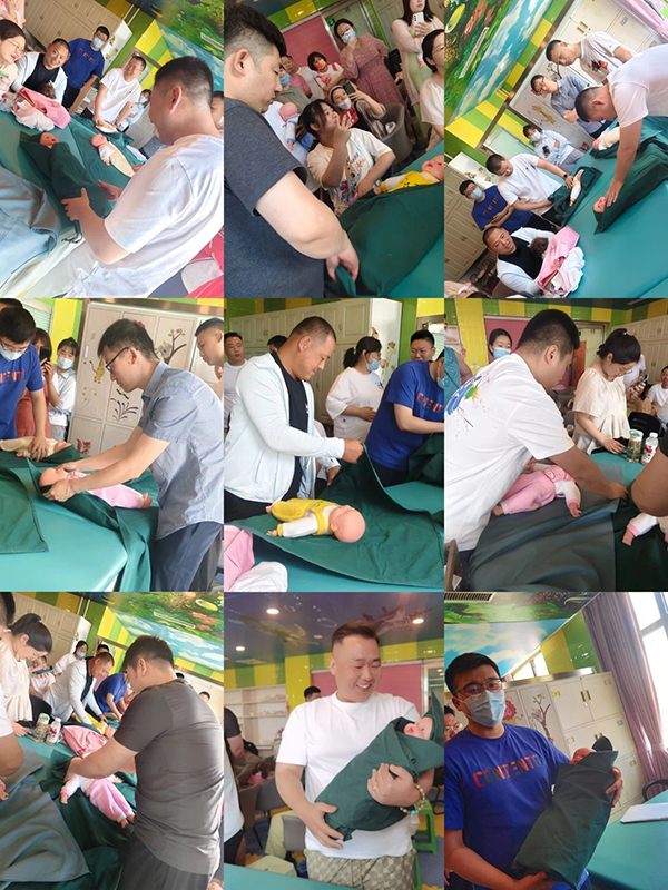 看到自己宝宝出生的那一刻,由男人变成一个父亲,手忙脚乱、不知所措,是许多爸爸的表现。孕育和养育宝宝不是准妈妈一个人的事情,准爸爸也是相当的重要。父亲节之际,医院孕妇学校开展“你是我的超级英雄——超级奶爸训练营”第二期。孕校朱江老师带领参加活动的新手爸妈学习如何包宝宝、抱宝宝、给宝宝换纸尿裤、给宝宝拍嗝、给宝宝穿衣服、海姆立克急救法等。