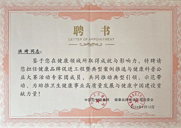 党委书记洪琦被聘为健康品牌促进工程·暨典型案例推选与健康科普公益大赛活动专家团成员