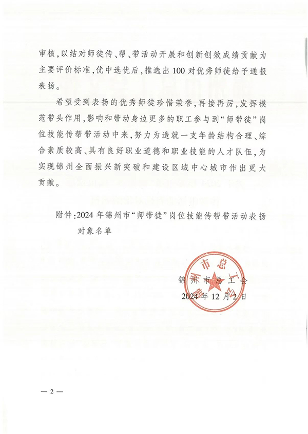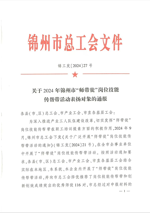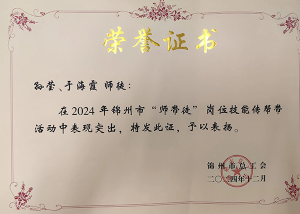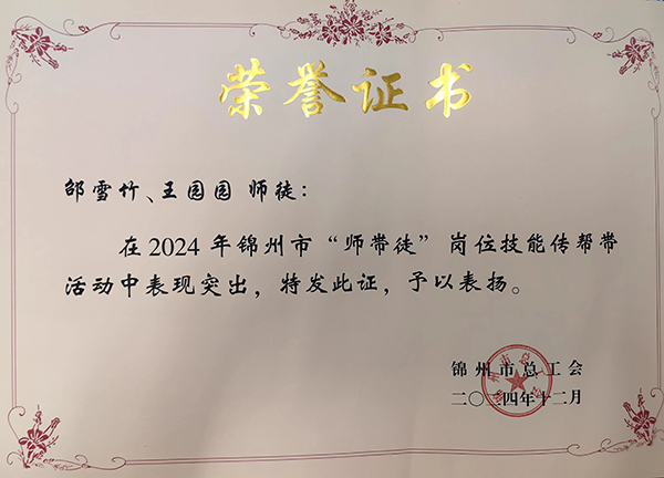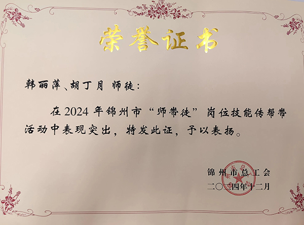 在2024年锦州市总工会组织的“师带徒”岗位技能传帮带活动中,我院7对师徒荣获“优秀师徒”。