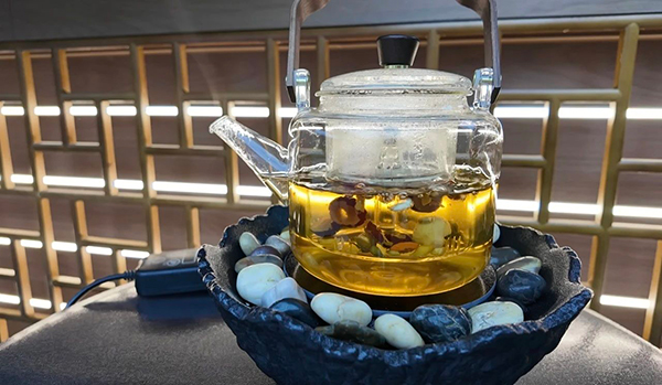“茶韵流芳”区飘来阵阵果香,百香果邂逅金桔柠檬,亲手调配的养颜茶饮让春色在杯中流转。