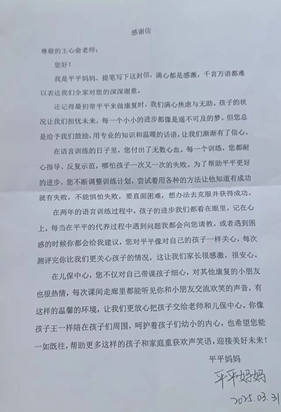 作为儿童综合发展中心的一名语言训练师,每当收到患者家属的锦旗、感谢信时,我的眼眶总是不由自主地湿润。上面的每一笔字迹,都承载着家长们沉甸甸的信任,也记录着孩子们从咿呀学语到流畅表达的蜕变之路。我深切感受到,所有日夜打磨训练方案、反复调整教学方法的付出,都化作了照亮孩子们成长的星光。