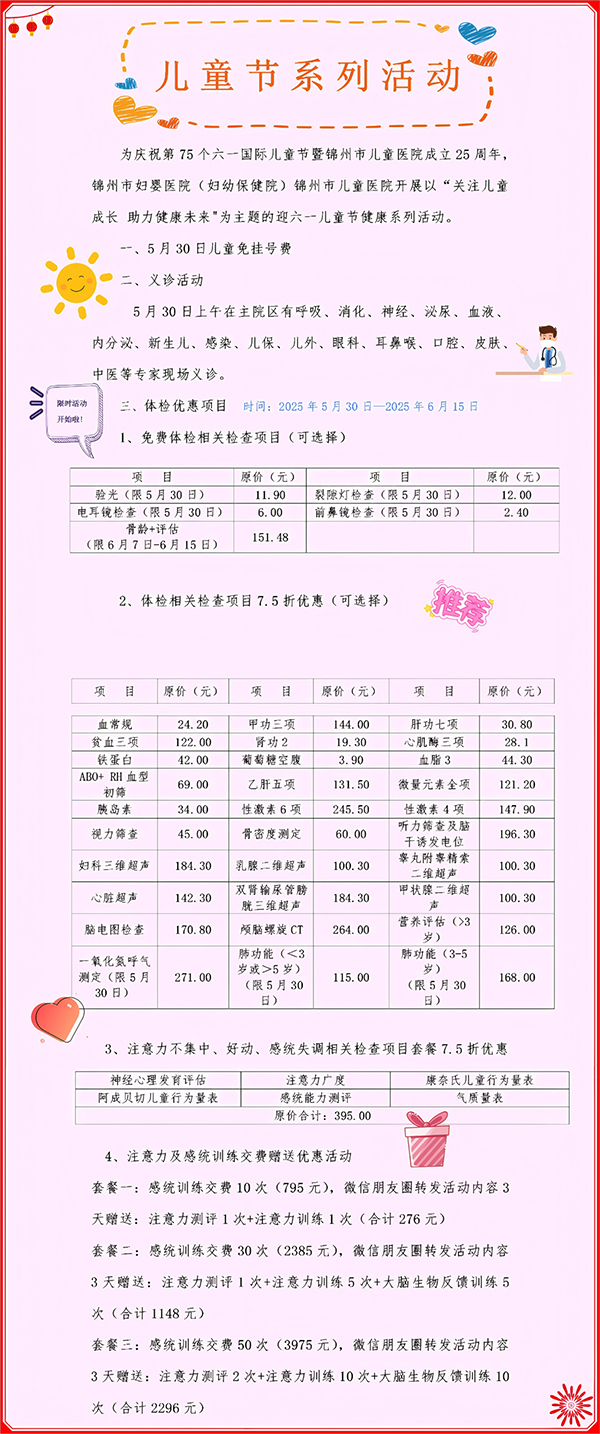 为助力儿童健康成长,医院在六一儿童节期间推出了体检套餐优惠活动。套餐涵盖了多个方面的检查项目,包括生长发育评估、血常规、视力检查、口腔检查等。活动期间,家长只需支付优惠后的价格,就可以为孩子进行全面的身体检查,方便家长随时了解孩子的健康状况。同时,医护人员会根据体检结果为家长提供专业的健康指导和建议,帮助家长及时发现孩子存在的健康问题,并采取相应的措施进行干预。