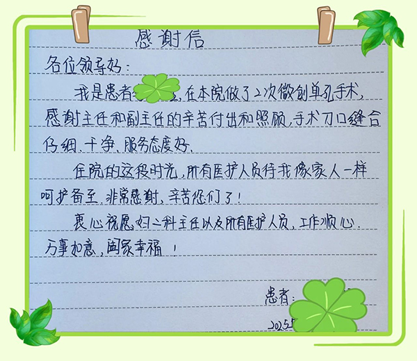 术后患者恢复良好,血HCG水平快速下降,腹部仅见隐藏在脐部内的微小疤痕。3日后,患者满意出院并留下一封感谢信。
