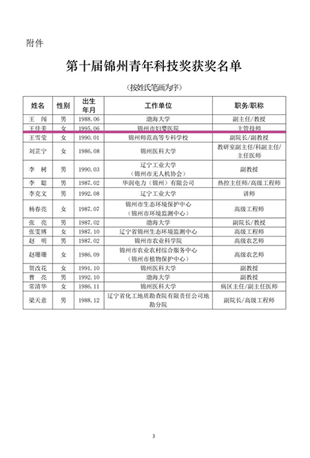 锦州市妇婴医院(妇幼保健院)王佳美同志荣获第十届锦州青年科技奖