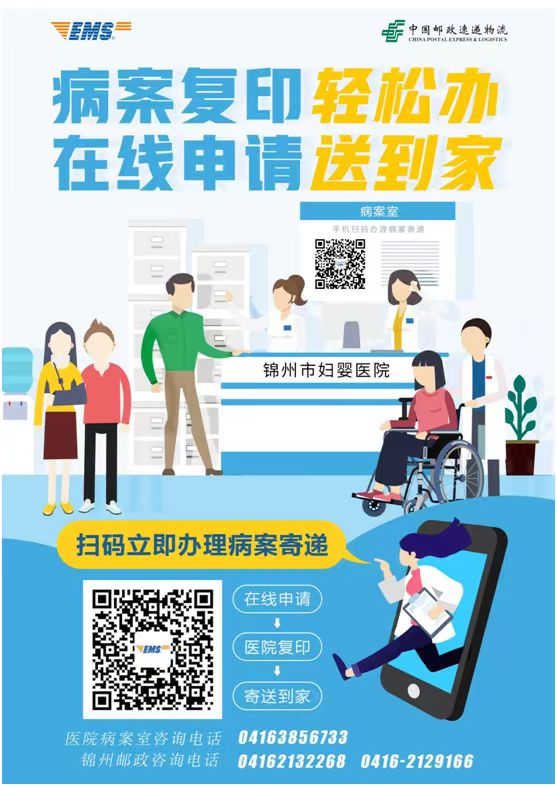 好消息,为了方便广大患者,锦州市妇婴医院联合中国邮政开展了住院病历邮寄业务,您只要微信申请,即可实现足不出户,病案邮寄到家!