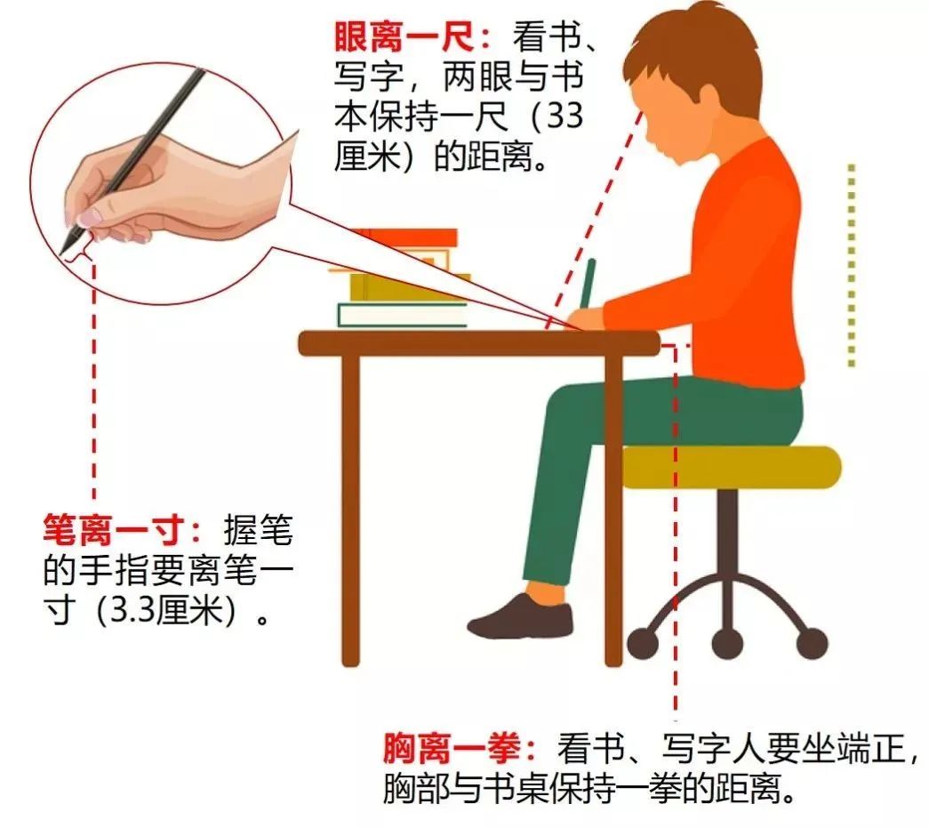 暑期孩子的读写姿势需要家长的关注。阅读书写时桌椅高度要合适,做到书本离眼睛一尺、胸口离桌一拳、握笔手指离笔尖一寸。