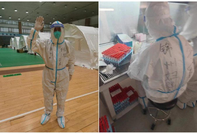 妇婴人张淼,本次是她第一次抗疫支援,身为一名共产党员,她时刻以共产党员的标准要求自己,用自己最饱满的热情全心全意的投入到核酸检测工作中。虽然第二天因为方舱的负压不适呕吐,她却只是出去喝点水后又马上穿上防护服进入方舱,投入紧张的工作当中。每天拆试剂、加样本、上机。她所在的2-2区创下了6时加完140板96孔样本的奇迹,不过这让她的手“胖”了一圈,她还和其他人开玩笑的说:“这胖是工伤”。因为担心夜班无法让自己在工作中保持高度集中,她又研究出个清醒新套餐“咖啡兑红牛,精神一整宿”。每年的中秋节都陪伴在父母身边的她,今年中秋节有了不一样的心愿——疫情消散,春回人间。国泰民安,疫情早散。