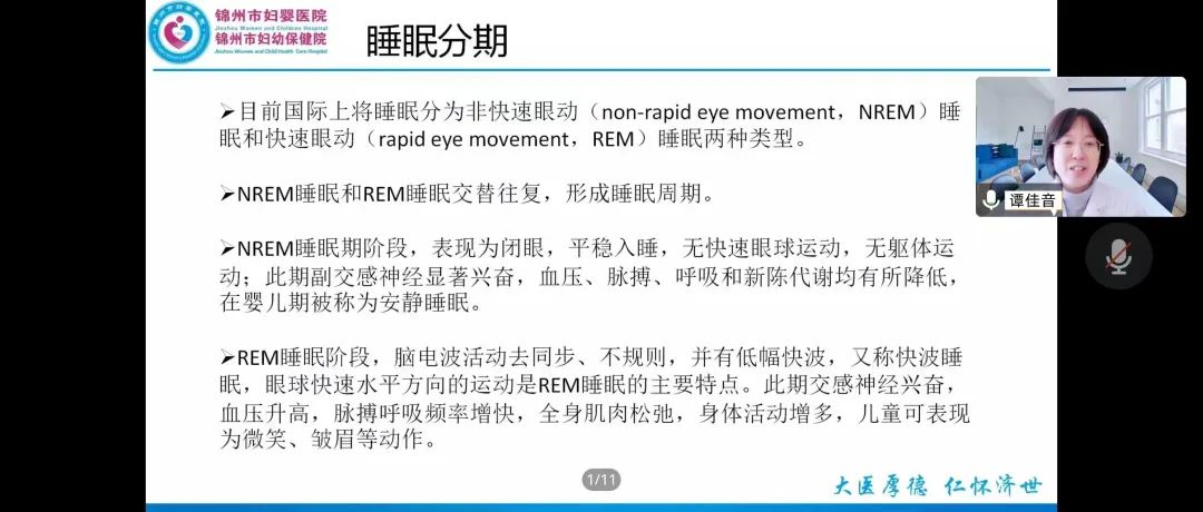 神经科副主任谭佳音做了题为《儿童常见睡眠障碍的鉴别》的报告,介绍了什么是儿童睡眠障碍,并就睡眠分期进行了详细的讲解。从而提醒家属睡眠障碍不容小觑,早预防、识别、评估和干预儿童睡眠问题,给予孩子健康的生长环境。