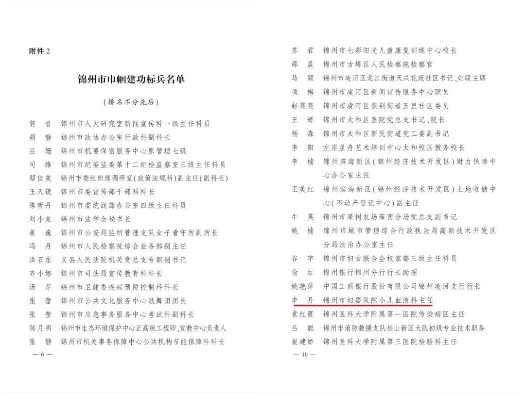 近日,锦州市妇联印发了《关于选树2023年锦州市城乡妇女岗位建功先进集体(个人)的通报》,锦州市妇婴医院(妇幼保健院)小儿血液科主任李丹同志喜获锦州市“锦州市巾帼建功标兵”荣誉称号。