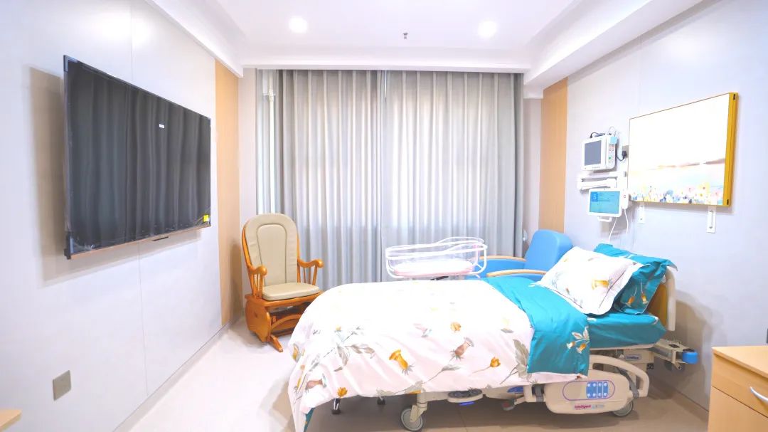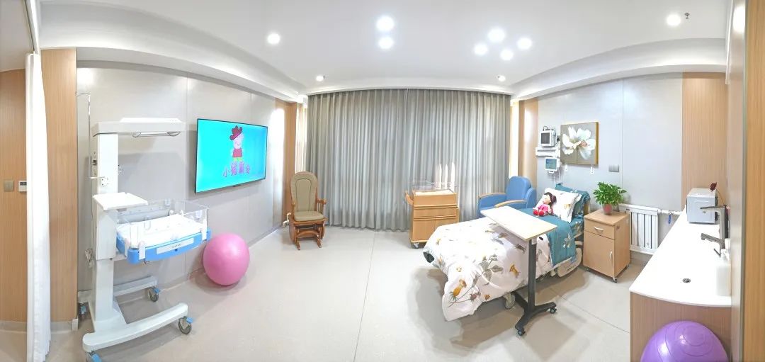 房间内配备了多种医疗设施,如多功能产床、新生儿复苏辐射保暖台、接产无影灯、分娩球、分娩凳、导乐车、摇椅、母婴监护仪、婴儿床、新生儿沐浴抚触台、空气消毒机、床单位臭氧消毒机、床旁智能交互系统等,享有集产科医生、新生儿科医生、麻醉师、助产士、母婴护士“五位一体”的高质量、高标准的服务。