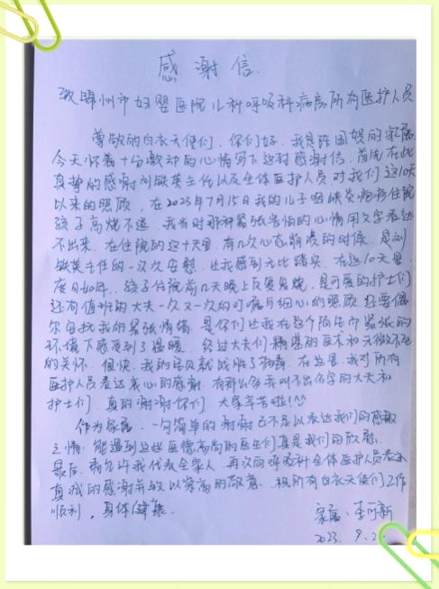 锦旗虽小,分量却重。它不仅传递了患者的感激之情,更是患者对我院医疗技术、服务品质的认可,对医护人员工作的充分肯定,彰显了医患之间的真诚与和谐。小儿呼吸科团队将以此为鞭策再接再励,不断提升诊疗技术和水平,不断优化护理服务质量,热情待患,真情暖患,真正做到为人民服务,让人民满意。