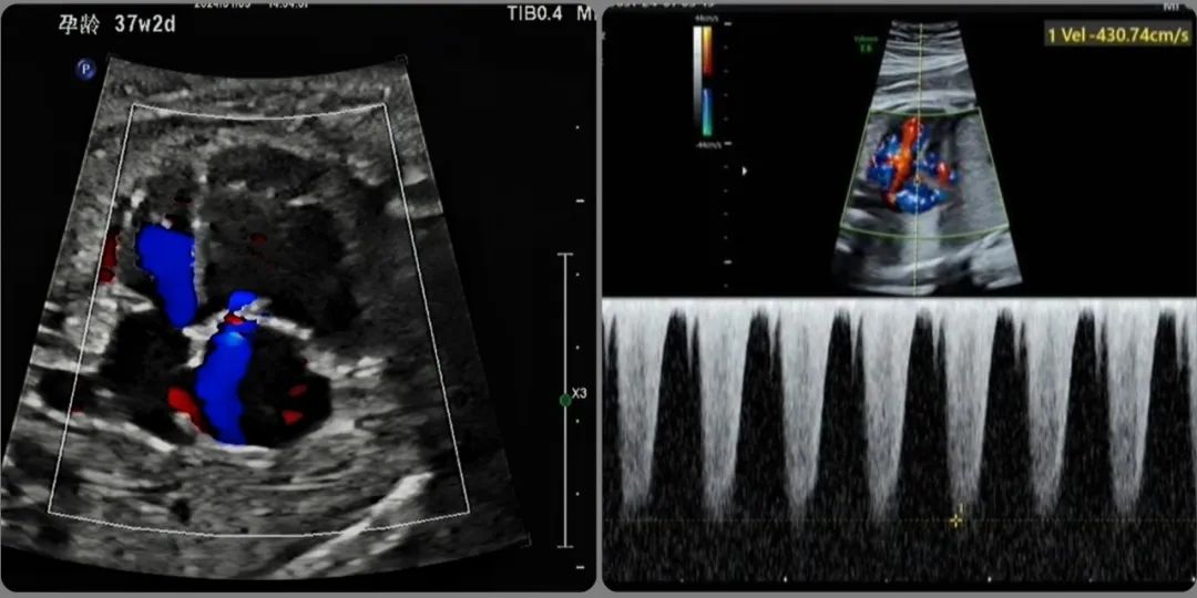经邵雪竹和李雯睿两位主任的会诊,发现胎儿除了右心扩大,三尖瓣重度反流外,还存在肺动脉扩张,肺动脉瓣反流,动脉导管走行迂曲,血流加快,局部狭窄,内径1mm,动脉导管少量反流,估测肺动脉压力>60mmHg,静脉导管a波反向,考虑胎儿动脉导管狭窄,即将关闭,并出现右心衰。