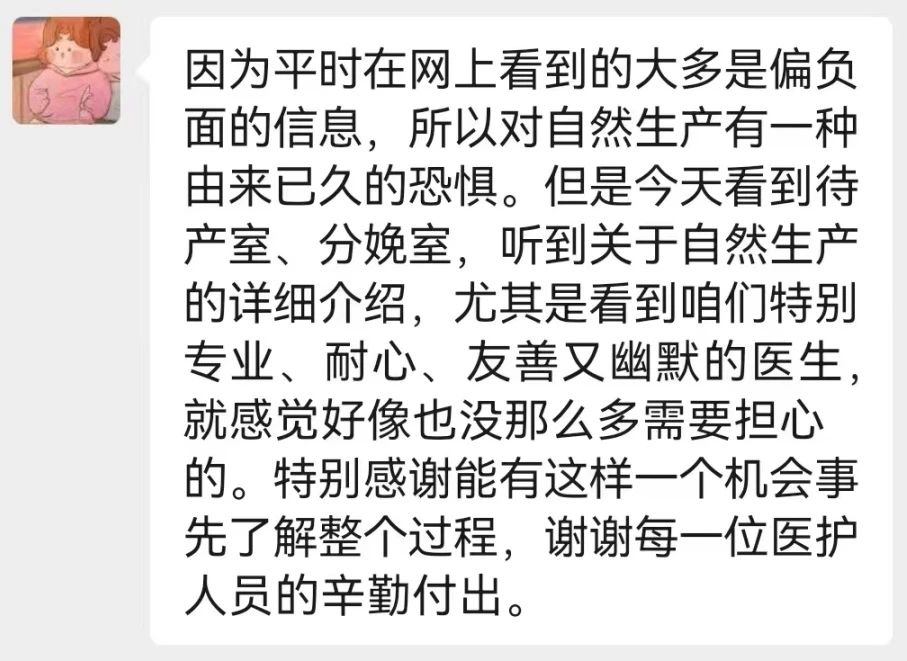 一位孕妈妈开心地说:“通过今天的参观,更加坚定了自己生产的信心,分娩室的环境很温馨,医生与助产士们都非常好,专业性强,态度温和,消除了我之前对分娩室的恐惧感。”