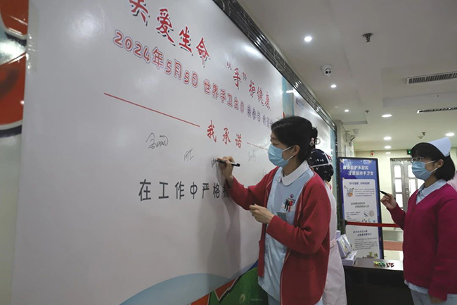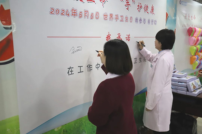由院领导带头,在标题为“我承诺:在诊疗过程中严格执行手卫生规范” 的承诺展板上签名并留影。