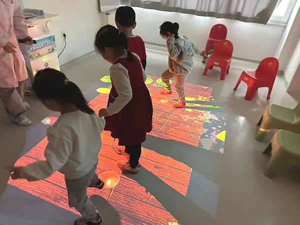 多媒体情景互动系统采用先进的投影技术和计算机交互技术,将画面投射于地面,营造感统训练的虚拟环境和丰富多彩的训练项目,当参与者踏入投射画面时,可以直接使用双脚或者双手及身体的各个部位与虚拟场景进行交互,产生各种互动效果,使观众置身其中,参与趣味十足的多感官训练项目。