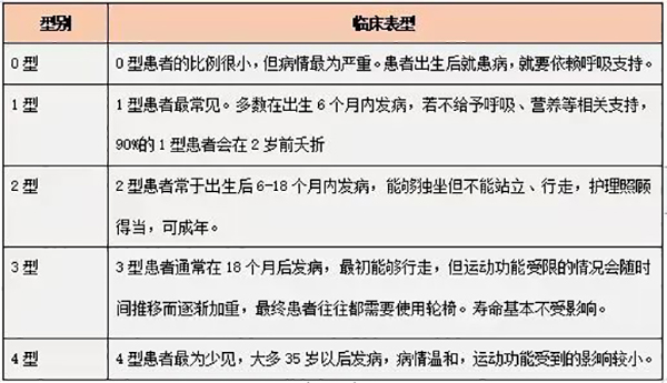 根据起病年龄、运动里程碑及病情进展程度等,SMA分为五型:
