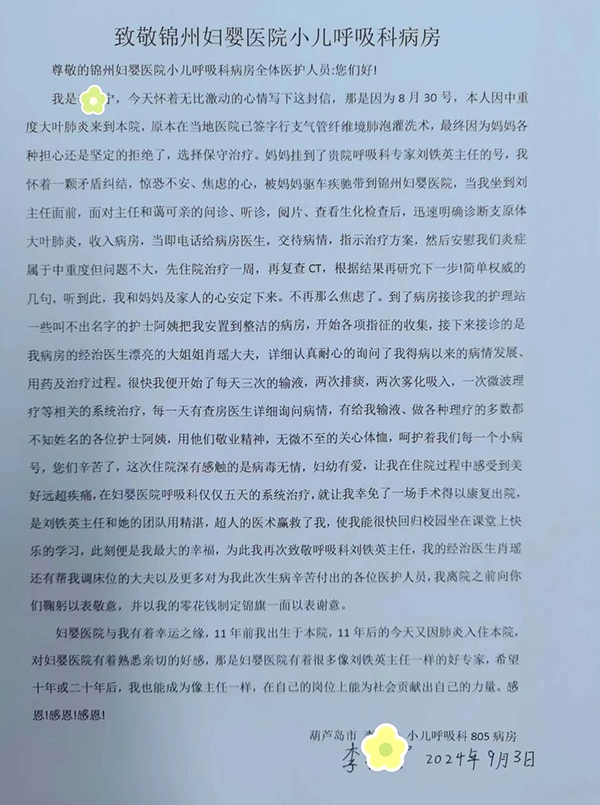 半个月前这名11岁的小女孩因为大叶性肺炎在当地医院治疗近10天,然而治疗效果并不理想,医院下了最后通牒,需要做支气管镜。可孩子大了,有自己的想法和意见,妈妈也不想强迫孩子,同时也心疼孩子。听说锦州市妇婴医院小儿呼吸科对于治疗大叶性肺炎经验丰富,并且设备完善,于是带患儿慕名前往我院,挂了刘铁英主任的号。刘主任查看患儿后立即收住我科病房,入院后马上完善了相关检查,并且评估患儿病情。住院第二天结果都出来后,告诉孩子妈妈:“先不要着急,从目前的检查情况看,可以暂时不做支气管镜。好好配合我们,一起加油!”于是在继续规律抗炎治疗的同时,予微波理疗、机械排痰等辅助,治疗期间医务人员更是每日查房,手把手教家属扣背等。一周的时间,在全科人员对患儿无微不至的关怀下,在家属给予了百分百的信赖和配合下,在医患的亲密合作共同作战下,母女两个收获了满意的结果,复查肺CT提示炎症明显吸收好转。不需要做支气管镜了!可以准备出院了!!