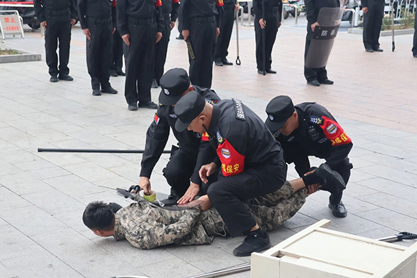 为进一步提升安保人员面对突发性事件的协同作战能力,现场模拟情景进行实战对抗演练。演练现场,工作人员模拟了1名“歹徒”,谩骂并持械威胁值班人员,试图威胁医护人员人身安全。安保人员立即通过对讲机请求支援,并携带长棍、防暴钢叉、盾牌等防暴器材通力将“歹徒”制服。