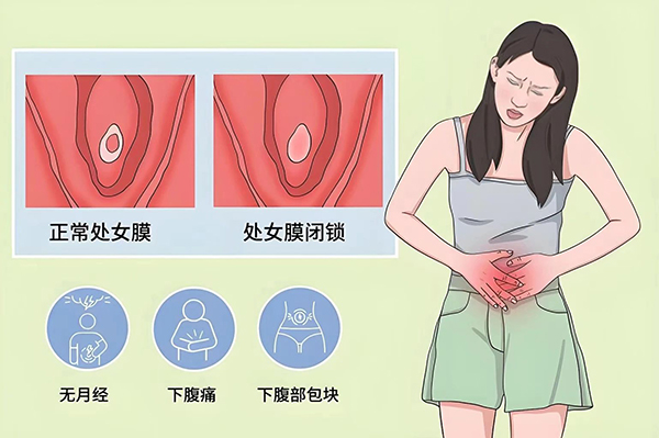 处女膜闭锁在青春期前因无任何症状而不被发现。多在青春期月经来潮后出现症状,主要表现为积液和压迫症状。典型表现就是周期性下腹痛及坠胀感。如果未及时发现造成经血逆流至腹腔,可能出现子宫内膜异位症的表现。此外大量阴道积液还会压迫尿道、膀胱出现排尿困难、尿频甚至尿潴留;压迫直肠出现便秘、大便困难等。