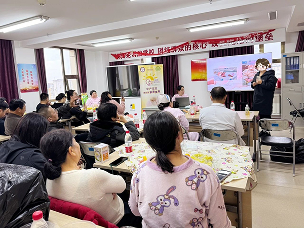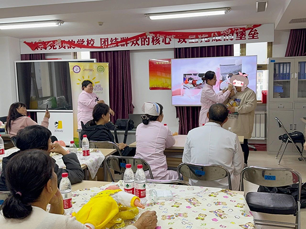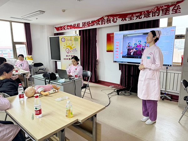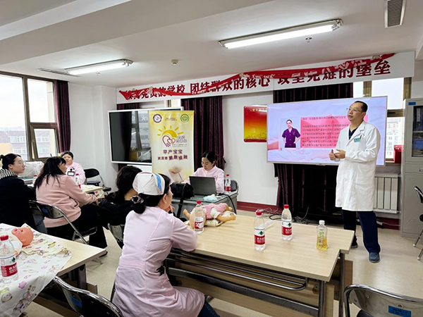 科室责护组长、主管护师朱胜楠为患儿家长们做了关于袋鼠式护理相关知识的理论授课,通过详细讲解,家长们了解到袋鼠式护理不仅是简单的肌肤接触,更是一种能促进早产儿生长发育、增强亲子联系的重要方式。