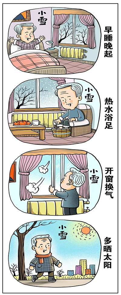 “冬三月,此为闭藏……早卧晚起,必待阳光”,小雪时节,应闭藏精气,养精蓄锐,敛阳护阴,起居应早睡晚起,“昼养阳,夜养阴”,每晚11点前上床入睡,待太阳升起时起床活动,有利于潜藏阳气,蓄积阴精。