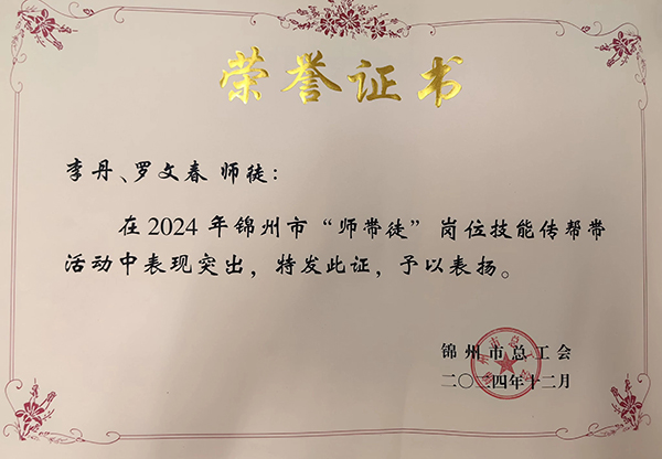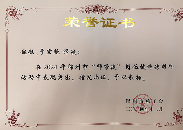 在2024年锦州市总工会组织的“师带徒”岗位技能传帮带活动中,我院7对师徒荣获“优秀师徒”。