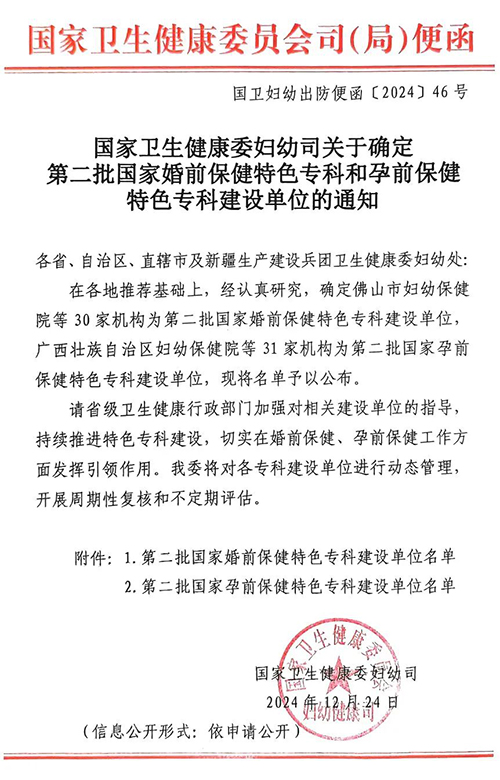 国家卫生健康委妇幼司为了进一步加强出生缺陷综合防治,保障母婴健康,树立科学婚育观,提高婚育质量和优生优育服务水平,特在全国医疗保健机构中评选出高水平、高质量、具有引领示范作用的婚前保健专科。锦州市妇婴医院(妇幼保健院)成功获批国家婚前保健特色专科建设单位,这是我院在专科建设领域取得的重大成果。