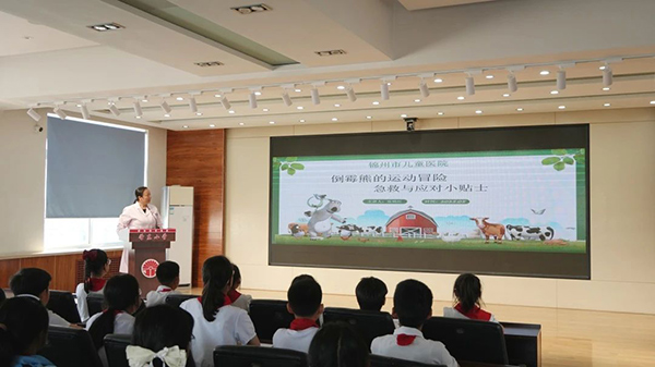 接下来是我院小儿外科副主任、主任医师张艳红,她以《倒霉熊的运动冒险急救与应对小贴士》为题,巧妙结合孩子们喜闻乐见的动画片形式,针对运动期间饮食及常见外伤、鼻出血等情况,在你来我往的抢答、问答中,从伤口清洁、消毒到包扎的完整处理步骤,伴着欢声笑语,深深印刻在孩子们的脑海里。