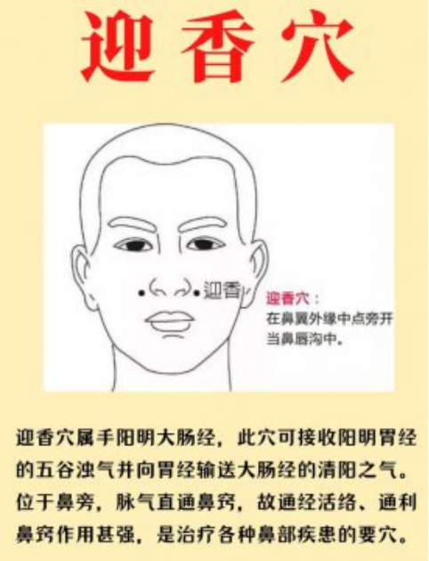 迎香穴(鼻翼两侧):缓解鼻干;