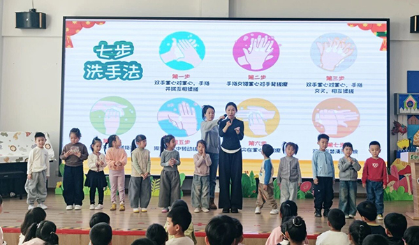 “要打败这些‘小怪兽’,正确洗手是关键!”进入实操互动环节,张医师结合趣味口诀,带领小朋友们逐步学习“七步洗手法”,从掌心到指缝、从指尖到手腕,细致讲解每个环节的操作要点。在寓教于乐的氛围中,孩子们跃跃欲试,纷纷举起小手认真模仿,用规范的动作践行着“健康小主人”的承诺。