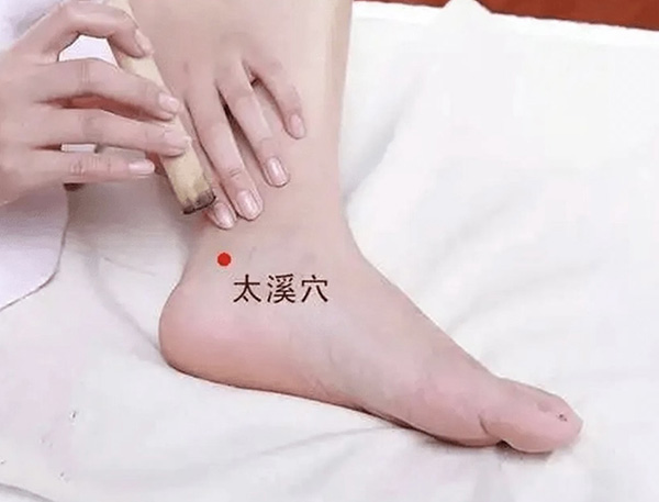 揉按太溪穴(内踝尖与跟腱之间凹陷处):滋补肾阴,调和阴阳。