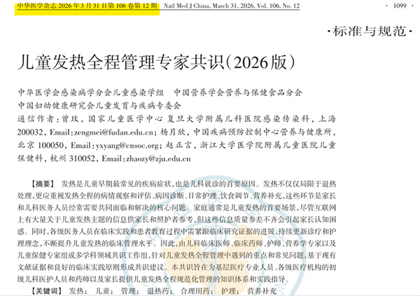 [1]中华医学会感染病学分会儿童感染学组;中国营养学会营养与保健食品分会;中国妇幼健康研究会儿童发育与疾病专委会.儿童发热全程管理专家共识(2026 版)[J].中华医学杂志,2026年106(12):1099-1118.